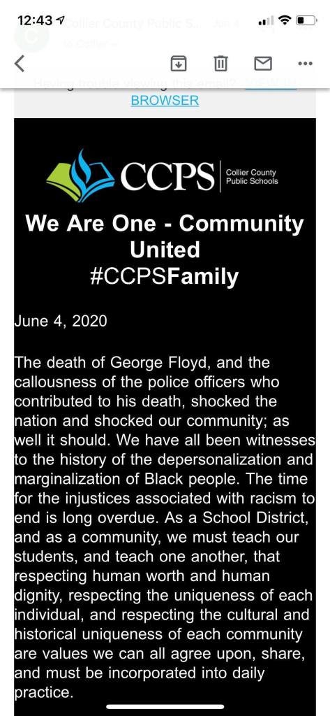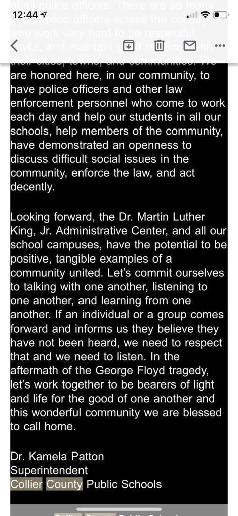 To put the email sent by Kelly Lichter into context, you need to read the email sent out by Kamela Patton, the superintendent of the Collier County Public Schools on June 4th.